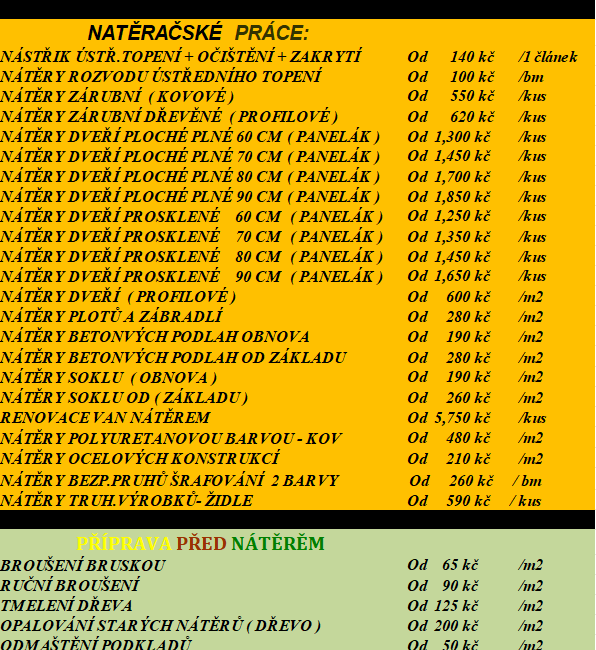Ceny za malířské a natěračské práce, přípravné malířské práce a ostatní související služby stanovujeme vždy individuálně a to na základě rozsahu požadovaných služeb, volených materiálů, členitosti, stavu a struktuře povrchu, přístupnosti a celkové náročnosti vyžadující provedení díla.