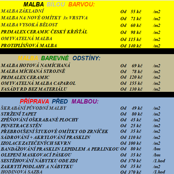 U barevné interiérové malby, při míchaní barev obecně platí, že čím je odstín světlejší, tím je jeho cena nižší. Orientační ceny malířských prací uvedené níže jsou uváděné včetně běžných materiálů, slouží pouze pro Vaši orientaci.
